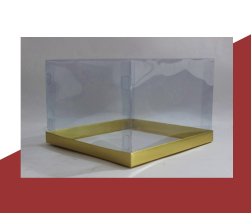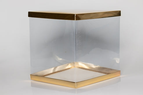 Premium 6" × 6" × 6" transparent PVC gift box for cakes and luxury gifts. Available in white, golden, and black—ideal for weddings and events.
